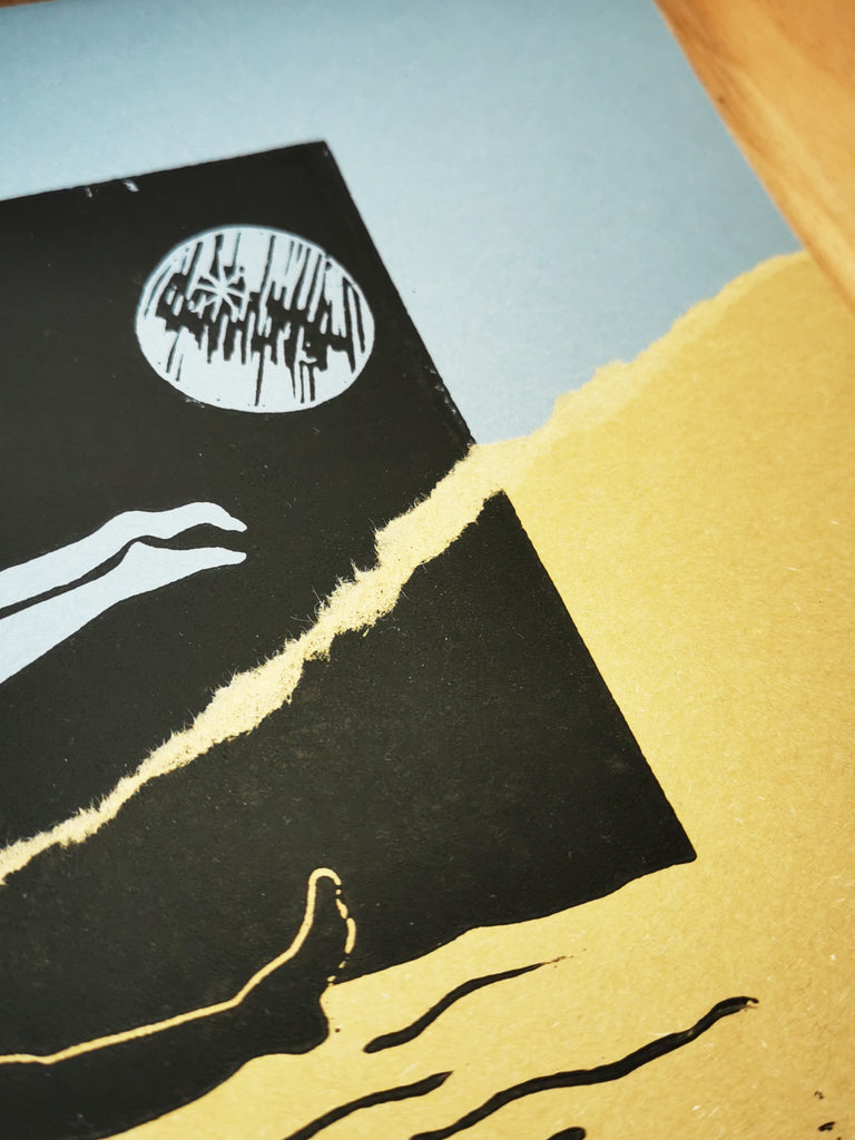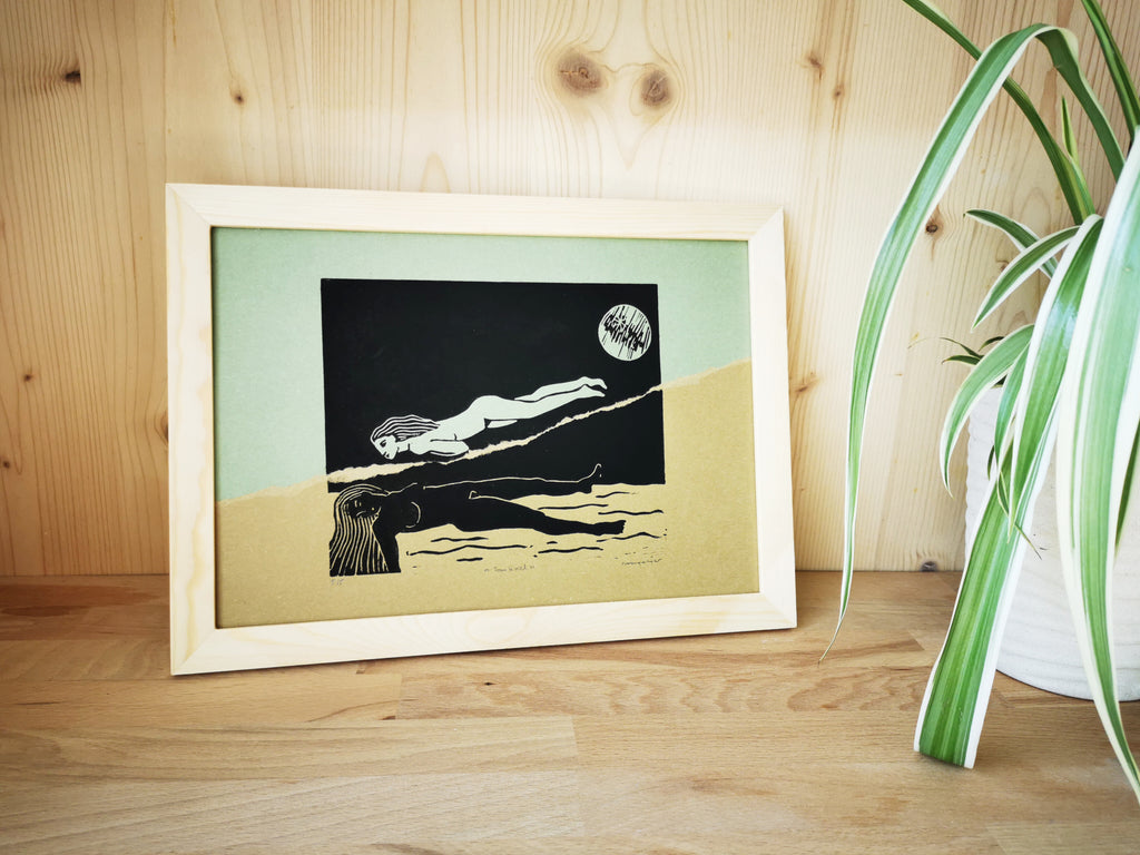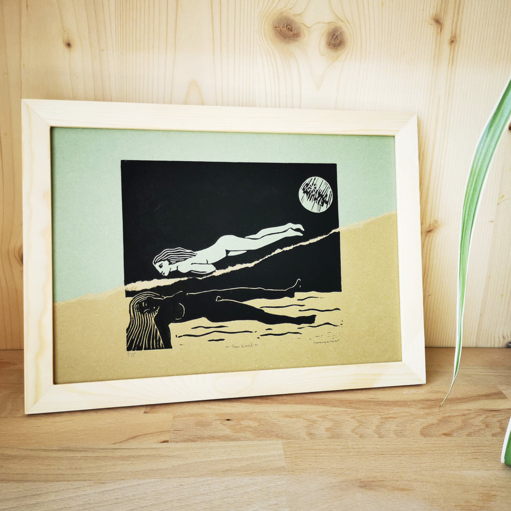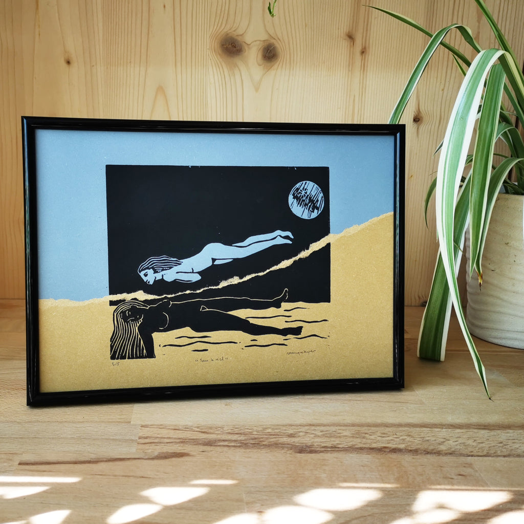 J'ai choisi de m'emparer à nouveau de la technique du collage, chère aux artistes du Surréalisme, pour ajouter une nouvelle dimension à ce motif emprunté. Jouer avec les couches de réalité superposées en déchirant littéralement la gravure imprimée sur papier "désert" (ocre), et en venant la coller sur la gravure imprimée sur papier "forêt" (vert) ou "océan" (bleu). En déchirant la réalité de la rêveuse, on découvre, sous le réel, l'univers de son rêve. Un univers que vous pouvez choisir au plus près des couleurs de vos rêves, rêves d'océan ou de forêt, flotter dans le bleu ou le vert.